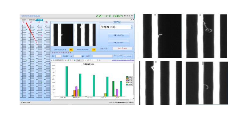 基于機器視覺技術研發(fā)的PE纖維在線檢測系統(tǒng)(超高分子量聚乙烯纖維檢測系統(tǒng)),可實時在線檢測每一根纖維上的毛絲、焦絲、毛團,并以落筒為單位存儲缺陷圖像。