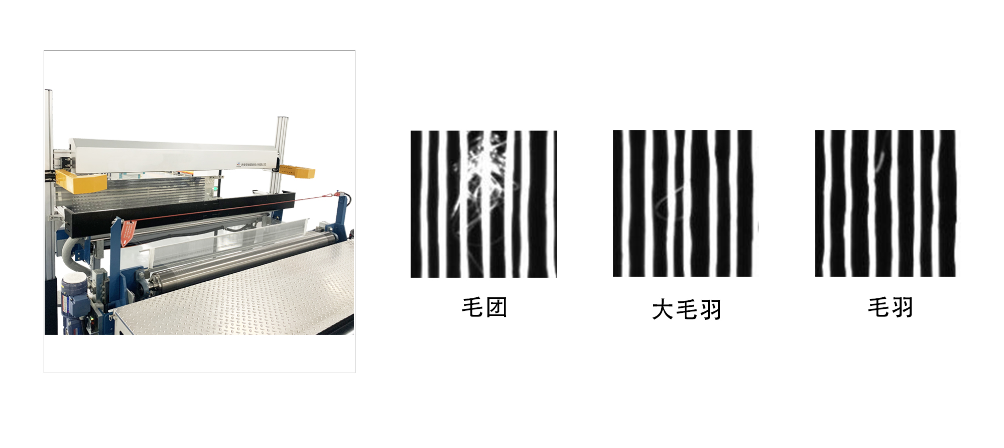 2、可檢測紗線毛羽、毛團,在每根紗線一定長度范圍內出現毛羽數量、毛團面積超出設定值時,進行報警或停機,操作人員可找到對應位置進行處理,以保證經線質量。